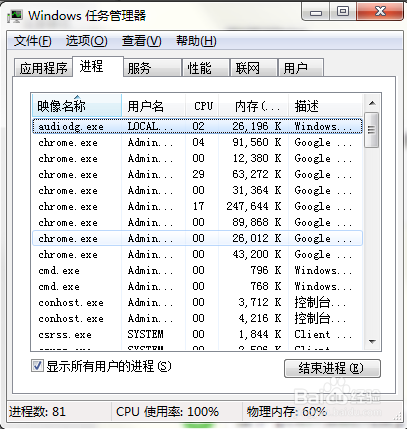 5.在任務(wù)管理器中進(jìn)程下,結(jié)束進(jìn)程explorer.exe,關(guān)閉任務(wù)管理器。在cmd.exe命令窗口輸入del uxtheme.dll 回車,再輸入ren uxtheme.dll.bak uxtheme.dll 回車。完成 重啟即可