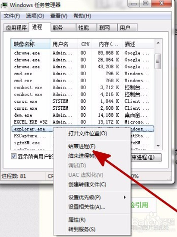 6、在任務(wù)管理器內(nèi)找到“Explorer.exe”點(diǎn)擊右鍵,選擇結(jié)速進(jìn)程;