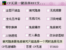 現(xiàn)在很流行使用rez文件來實(shí)現(xiàn)輔助功能了,針對玩家的需求,cf無道制作了一鍵選擇REZ文件多功能工具,內(nèi)涵隱身不掉血、無視閃光煙霧、免疫裝死、無視自爆、打人暴血、出玫瑰、透視等功能,歡迎下載體驗(yàn)。