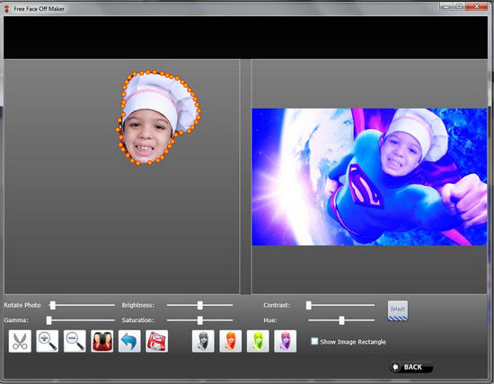 摳圖軟件(Free Face Off Maker ) v3.0 官方免費版 創(chuàng)造有趣的照片通過移植任何面對任何的身體和分享的樂趣與您的朋友。支持選擇有趣的背景模板,調(diào)整容易,面對允許旋轉(zhuǎn)和調(diào)整亮度、對比度、伽馬、飽和度和色調(diào)效果。
