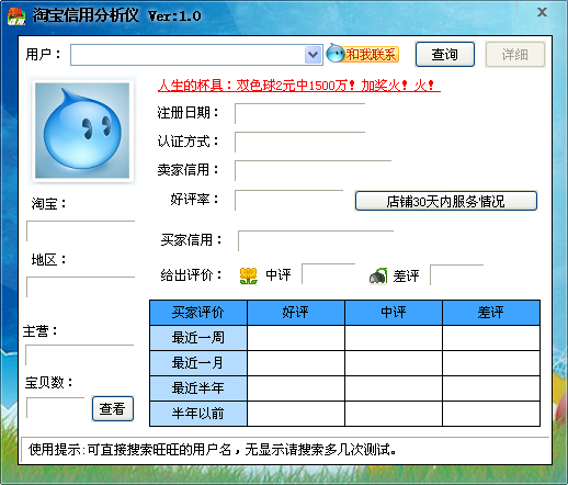 淘寶信用分析儀是可以快捷顯示賣家買家的信用度、給于評分、退貨信息等功能的一款軟件;假如您是賣家肯定會擔(dān)心購買者是否真心來購買的,通過此軟件可以不用打開網(wǎng)頁來快捷查詢用戶以前購買的給于評分,可快捷的識別購買著是否故意搗亂者;假如您是買家,通過此軟件可以快捷而不需要打開瀏覽器來查詢店鋪賣貨信息,包含可查詢購買著評分和退貨信息。
