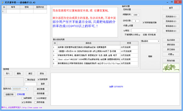 天天愛中獎活動助手是一款不錯的活動輔助,天天愛中獎活動助手天天愛中獎活動助手可以輕松獲得最新有獎活動的獎勵,包括Q鉆、Q幣、手機(jī)等,同時(shí)通過本軟件,能夠及時(shí)了解最新活動信息,活動達(dá)人們,趕緊下載收藏吧。