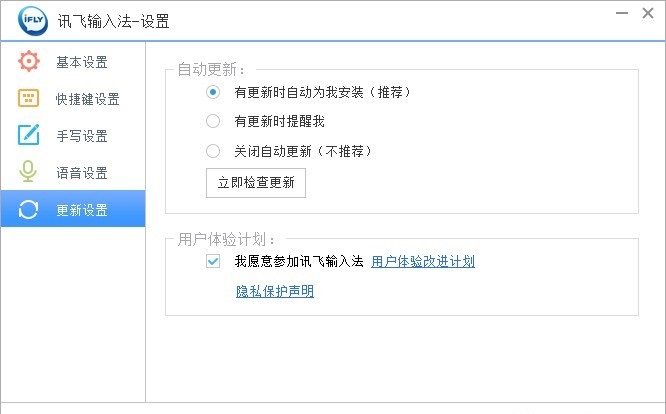 自動更新:可以對輸入法PC版更新進行設(shè)置,包括有更新時自動為我安裝(推薦)、有更新時提醒我、關(guān)閉自動更新(不推薦),默認有更新時自動為我安裝(推薦)。