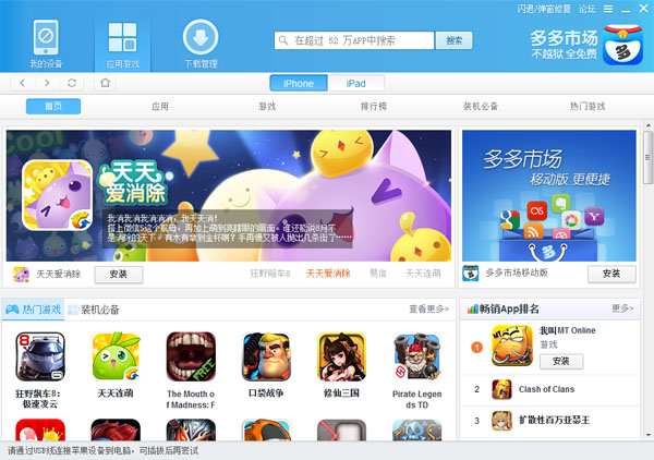 多多市場是一款全面支持iphone、ipad、ipodtouch的ios應(yīng)用下載和安裝工具。多多市場具備操作簡單、使用安全、快速下載等特點,并且無需越獄免費安裝蘋果應(yīng)用,讓你輕松享受蘋果手機樂趣。