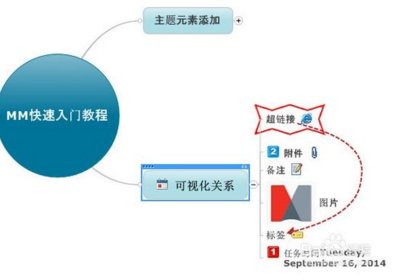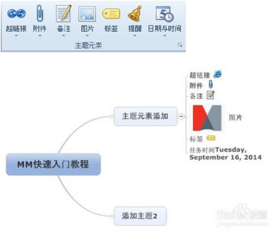 點(diǎn)擊功能區(qū)插入菜單中的工具,可以為主題添加超鏈接、附件、備注、圖片、標(biāo)簽、提醒以及指定任務(wù)信息等信息??梢杂覔糁黝},選擇需要的主題元素添加到思維導(dǎo)圖。