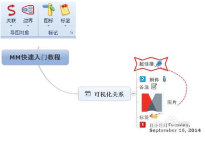 點(diǎn)擊功能區(qū)插入菜單中的工具,插入導(dǎo)圖對象或者標(biāo)記,可以為主題添加特殊標(biāo)記來對主題進(jìn)行編碼和分類、使用箭頭展現(xiàn)主題之間的關(guān)系、使用分界線功能環(huán)繞主題組或者使用圖像說明導(dǎo)圖。也可以通過右擊主題,使用相關(guān)命令。