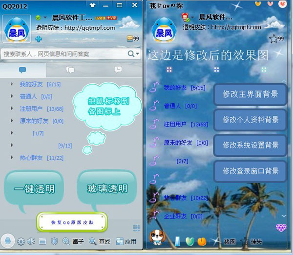 晨風(fēng)qq透明皮膚修改器最新推出2014qq皮膚修改器。本款修改器頁面簡潔,操作簡單,只需一鍵修改就可設(shè)置偶像、美景、愛人各類圖片為你的QQ皮膚。打造最酷QQ皮膚盡在晨風(fēng)qq透明皮膚修改器。