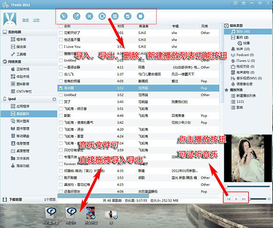 點擊“音樂”,直接拖拽音樂進行導出導入。點擊【新建列表】,可以把音樂按個人喜好歸類。點擊界面右下角【播放】按鈕,可以直接試聽音樂。
