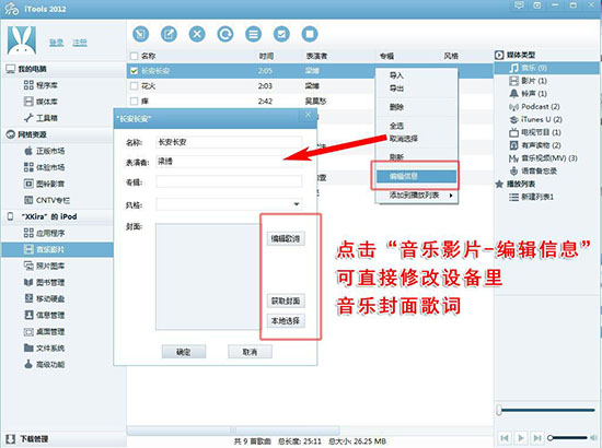選擇音樂右擊可以給音樂添加封面歌詞。(PS:設備上直接添加歌詞僅支持iOS6系統(tǒng),其他系統(tǒng)可在”我的電腦-媒體庫”批量添加封面歌詞。)