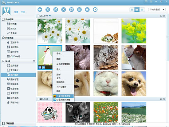 點擊【照片圖庫】,iTools會顯示所有照片壁紙,你可以直接對所有照片導出、導入、刪除、歸類,也可以用iTools預覽照片、分享到微博。相機膠卷相機膠卷導入時,需要安裝并打開應用兔才能可以。