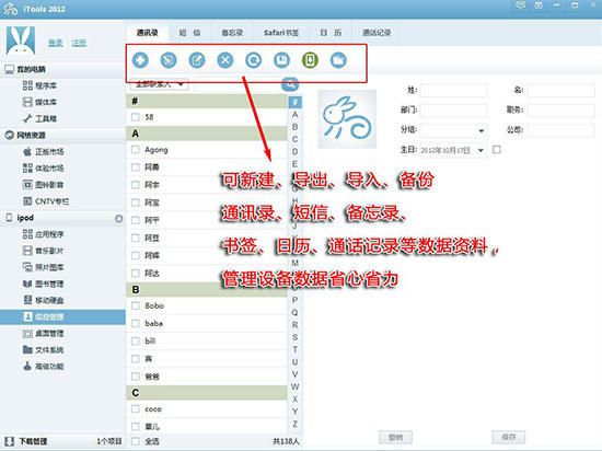 點擊【信息管理】,可以對通訊錄、短信、備忘錄、書簽、日歷、通話記錄進行新建、導出、導入、備份等操作。