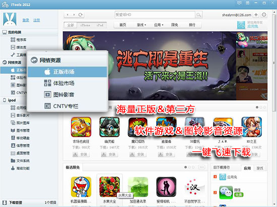 喜歡到網(wǎng)上搜羅各類新奇好玩熱門游戲軟件和圖鈴影音的盆友可以到iTools網(wǎng)絡資源專區(qū)逛逛。iTools有正版市場、體驗市場、圖鈴影音專區(qū)以及CNTV專欄,你可以查找下載所需軟件、圖鈴影音資源,豐富你的Apple 設備。