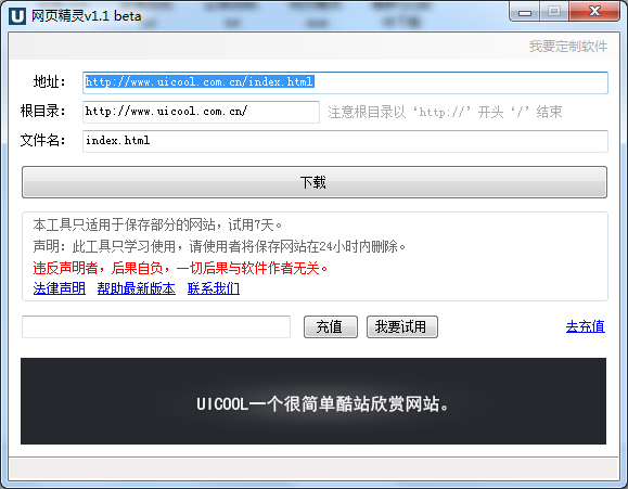UI酷網(wǎng)頁(yè)精靈是一款網(wǎng)頁(yè)下載工具,適用于網(wǎng)頁(yè)設(shè)計(jì)師(美工)使用,UI酷網(wǎng)頁(yè)精靈可以把網(wǎng)站原目錄保存到本地,適用于大部分模板網(wǎng)站、企業(yè)網(wǎng)站,另外還能將部分網(wǎng)站頁(yè)面下載保存為靜態(tài)頁(yè),支持JS,flash,CSS文件保存,支持部分模板網(wǎng)站,靜態(tài)頁(yè)網(wǎng)站,動(dòng)態(tài)頁(yè)網(wǎng)站,歡迎下載體驗(yàn)。