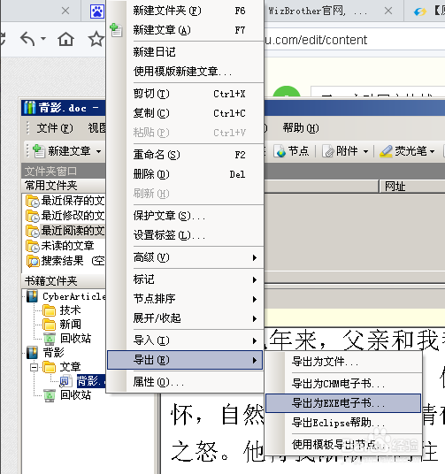 現(xiàn)在,在你新建好的書籍欄下就出現(xiàn)你導(dǎo)入的文件了,然后選擇背影選項(xiàng)卡,右鍵單擊,選擇導(dǎo)出--導(dǎo)出為EXE電子書,就會(huì)出現(xiàn)一個(gè)電子書的編輯窗口。這樣就可以單擊文件選項(xiàng)進(jìn)行保存了。