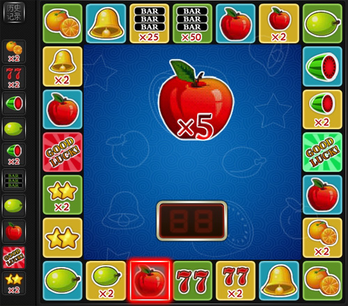 幸運水果機最為常見的是在街機廳中見到的,界面由24個方格拼接成一個正方形,每個方格中都有一個目標(biāo)(多個不同的圖形,通常為水果),且每個方格下都有一個小燈。玩家投入游戲幣后,選擇希望押注的目標(biāo),當(dāng)玩家按下開始鍵后,小燈開始繞著正方形中每個格子轉(zhuǎn),當(dāng)小燈停下來時,如果停在玩家押注的目標(biāo)上時,則玩 家可贏取相應(yīng)的游戲幣。想要贏的更多,參與猜大小吧,你可以獲得更多的金幣,這就是99電玩準備的有一大特色,在保留原有的玩法上不斷推陳出新