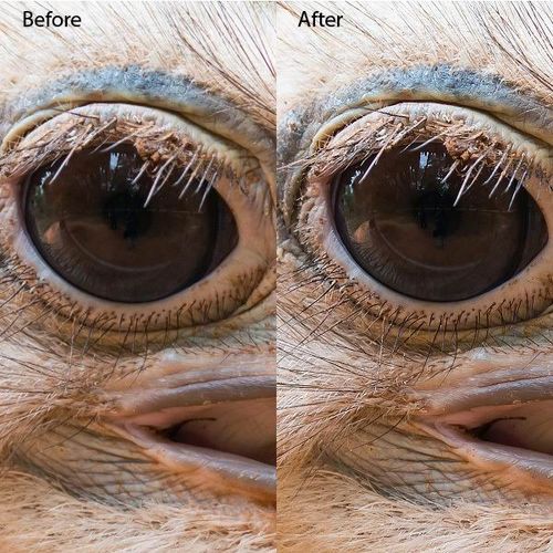 下面的圖片顯示的是鴕鳥頭特寫照片在應(yīng)用智能銳化濾鏡之前和之后的效果。