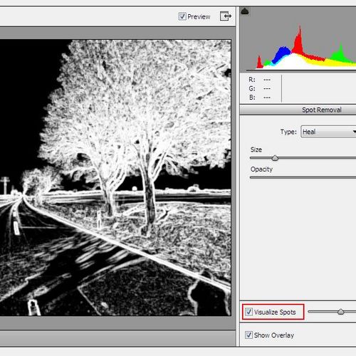 形象化景點(diǎn)選項(xiàng)可以幫助你找到工作時(shí)屏幕上沒有發(fā)現(xiàn)的缺陷,這些缺陷雖然在電腦屏幕中看不到,但在全分辨率的照片打印中是可見的。當(dāng)您選擇此選項(xiàng),圖像將被導(dǎo)在Camera Raw中的過濾器窗口?,F(xiàn)在你可以使用污點(diǎn)去除工具形象化景點(diǎn)模式,清理圖像。簡(jiǎn)單理解是通過黑白模式找到不合理的區(qū)域。
