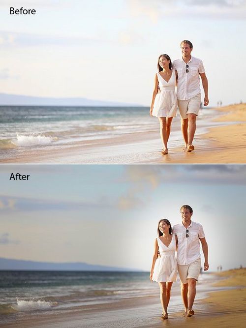 例如,筆者這里展示一下怎么應(yīng)用徑向過濾器調(diào)整一對(duì)夫婦在海灘上散步的照片。減少選定區(qū)域之外的曝光,使你得到一個(gè)當(dāng)?shù)氐木植孔兞恋男Ч?,讓中心變得更加顯眼。