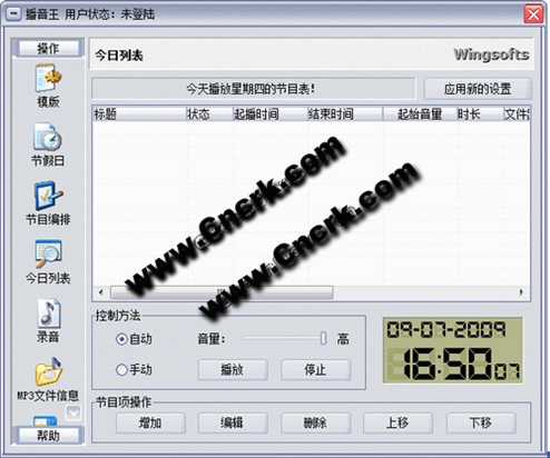 《[翼南]播音王》是一個可以定時開機、定時播放音樂及視頻、定時關(guān)機的全自動播音軟件。跟同類軟件相比,其最大的特點是可以控制播放時間的長短,多個播音模板可供選擇,節(jié)假日(如星期六、日,元旦春節(jié)等)不播音,也可以設(shè)定倒班及加班日期播音。完全不須人工干預,自動播音