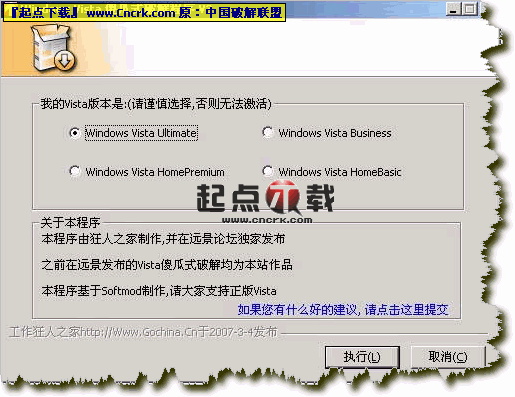 基于Softmod的Windows Vista傻瓜工具,在Vista下即右鍵點(diǎn)擊此程序,選擇“在管理員模式下運(yùn)行”,按提示選擇正確的版本后,點(diǎn)“執(zhí)行”自動(dòng)導(dǎo)入授權(quán)證書(shū),自動(dòng)更換序列號(hào),自動(dòng)安裝SoftMod補(bǔ)丁,重啟后即可進(jìn)行激活.