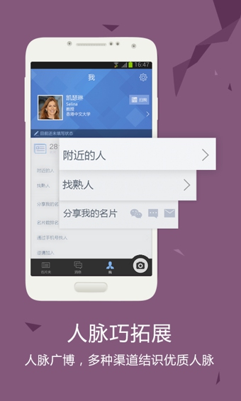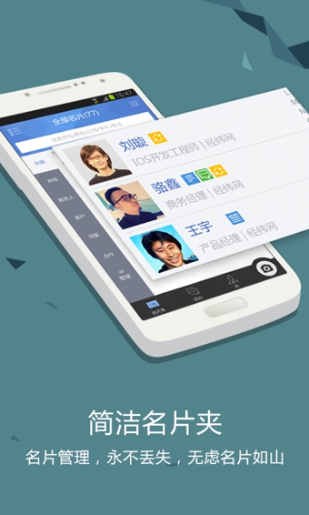 經(jīng)緯名片通是人人網(wǎng)旗下經(jīng)緯網(wǎng)出品的名片識(shí)別及商務(wù)社交工具,自推出后深得用戶喜愛,長(zhǎng)期在app store同類產(chǎn)品中排名第一。曾經(jīng),那些夜以繼日的忙碌 創(chuàng)造展現(xiàn)自我的職業(yè)舞臺(tái) 良好的人脈關(guān)系助我成功 成功背后那些不為人知的糾結(jié) 因?yàn)橛辛说昧χ侄鴱娜?貼身秘書還是這樣的好【軟件特點(diǎn)】