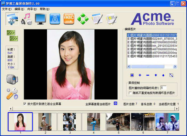 簡易快速地制作屏幕保護;完全集成的屏幕保護編輯界面,自適應(yīng)桌面主題,制作更方便;支持圖片格式:Bitmap、Jpeg、Gif、Pcx、Tga、Png 和 Tiff;支持音樂格式:Mp3、Wma、Wav 和 Midi;可以按順序或隨機地播放屏保的圖片和音樂;可定制的屏保背景和輪廓;每張圖片都可以添加靜態(tài)說明文字;可以動態(tài)地顯示標題短語文字;平滑圖片切換特效;動態(tài)文字特效;支持顯示Lrc格式的歌詞文件;可以為屏保安裝程序定制圖標和標題圖片;創(chuàng)建可自動安裝的屏幕保護文件。