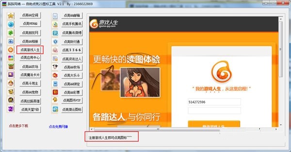 您的位置:起點(diǎn)軟件下載電腦軟件系統(tǒng)軟件踩踩自助點(diǎn)亮QQ圖標(biāo)工具 v2.1 綠色版