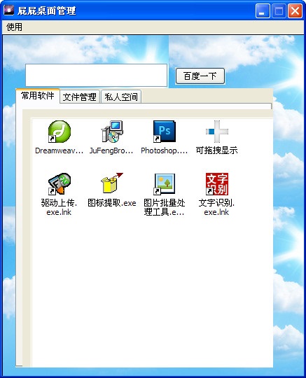 屁屁桌面管理是一款輕巧綠色的桌面管理軟件,它模仿強大的vstart。支持文件拖放,圖標(biāo)變化,也就是管理你的桌面,私人空間管理,密碼保護。
