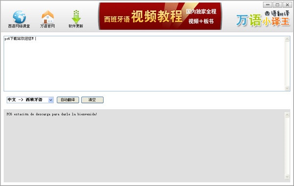 萬(wàn)語(yǔ)小譯王西班牙語(yǔ)翻譯是一款可以將中文轉(zhuǎn)換為西班牙語(yǔ)或西班牙語(yǔ)轉(zhuǎn)換為中文的漢化軟件西班牙語(yǔ)翻譯器,輸入想要被翻譯的文字,然后點(diǎn)自動(dòng)翻譯即可。