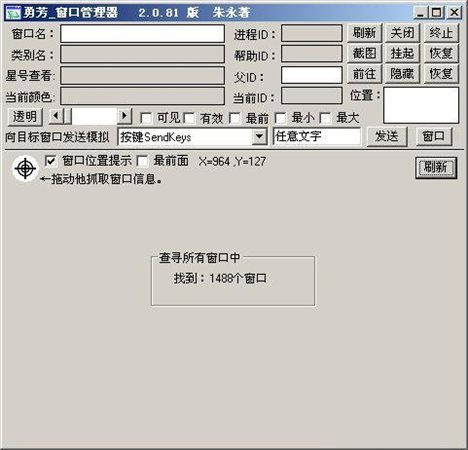 勇芳窗口管理器是一款用于查看和改變軟件窗口屬性以及調試信息的軟件,制作勇芳系列的游戲輔助時的必備工具,編程初學者或者用處會比較大,WIN系統(tǒng)是由窗口組成的,凡是軟件,就必需有窗口,窗口管理器,正是管理與操作他們的。勇芳窗口管理器是針對其他窗口編程時必不可少的工具,初學者也可以用作改變窗口屬性的工具。