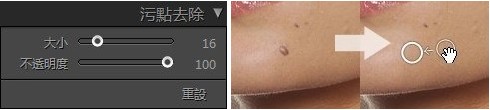 1. 滑動(dòng)控制大小的滑塊或者用滑鼠滾輪來(lái)調(diào)整污點(diǎn)去除圓環(huán)的影響范圍。將控制不透明度的滑塊向左滑可以在選中區(qū)域增加一些透明度。
