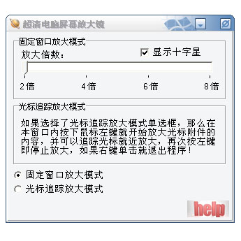 一,固定窗口放大模式:本模式下,光標(biāo)附近的內(nèi)容實(shí)時(shí)放大顯示在本軟件窗口內(nèi),可以提供2倍-8倍的放大效果,足以滿足您的需求,同時(shí)提供了十字準(zhǔn)星選項(xiàng)供選擇,方便瞄準(zhǔn)校對(duì)特殊內(nèi)容!
