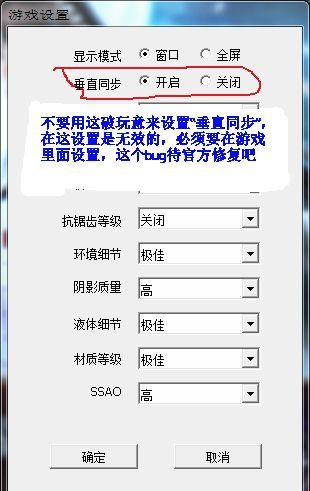 2)使用游戲中的設(shè)置(見(jiàn)綠色選項(xiàng)部分),把垂直同步關(guān)掉,大幅提升游戲體驗(yàn):