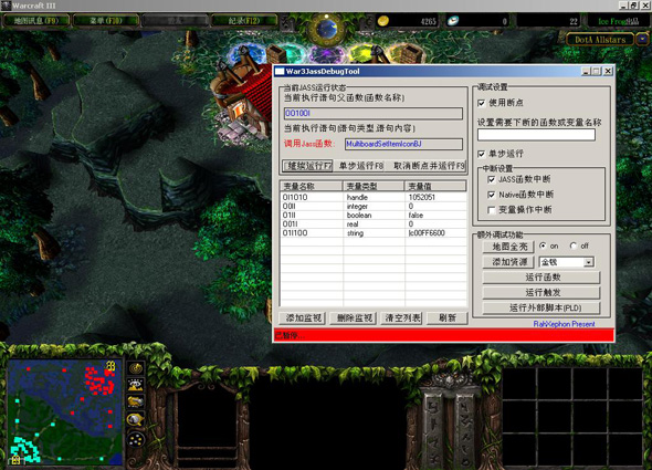 1.允許在JASS函數(shù),NATIVE函數(shù)和任意全局變量上下斷點(diǎn),JASS腳本運(yùn)行到該函數(shù)或變量時會自動暫停