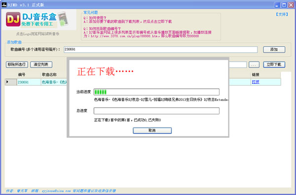 DJ音樂盒免費(fèi)下載專用工具是高音質(zhì)DJ音樂的下載軟件,操作簡單,到DJ音樂網(wǎng)下復(fù)制你所下載的歌曲序號到本軟件中進(jìn)行添加下載即可。