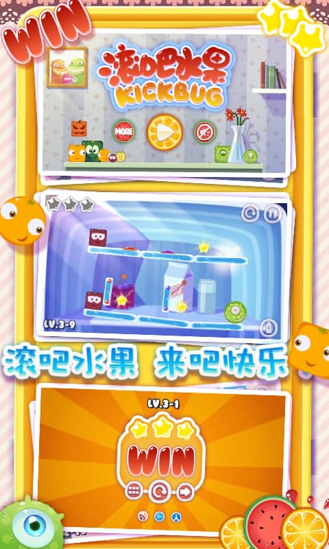 本作關(guān)卡豐富多變,4個(gè)主題鮮明的世界各自搭配24個(gè)設(shè)計(jì)精巧的關(guān)卡,共有96個(gè)花樣不同的關(guān)卡在等著你。不同世界將給與你不同的體驗(yàn),隨著關(guān)卡的升級(jí),場(chǎng)景元素還會(huì)發(fā)生變化,傳送門、機(jī)關(guān)、冰層等等逐漸加入,甚至水果也會(huì)有新花樣,水果們并不是都只會(huì)滾的哦!能飄起來(lái)的,能彈開其他水果的,請(qǐng)期待吧!另外值得一提的是,本作以家做主題,場(chǎng)景都是您會(huì)非常熟悉的家內(nèi)畫面,各色水果表情生動(dòng)多變,賤萌的、腹黑的、呆傻的,各種款型萌殺你必須的!