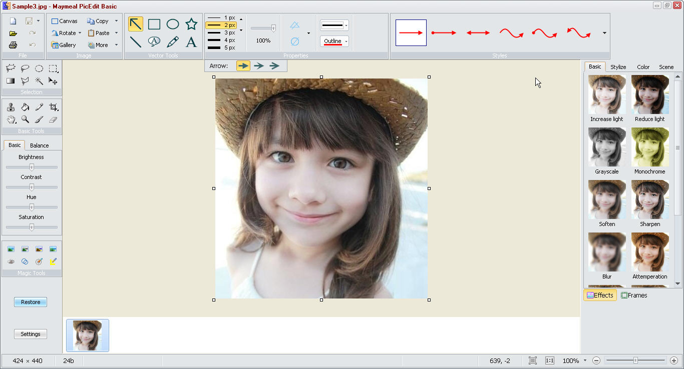 完美融合矢量圖編輯與位圖處理,支持各種圖形樣式(如箭頭、線條、手繪線條、矩形、圓弧、多邊形、文本、位圖對象等),支持各種特效處理(如高亮、馬賽克、變色筆、熒光筆、縮放筆、扭曲筆、模糊、補光、柔化、銳化、降噪、調(diào)溫、風(fēng)格化等),同時支持選區(qū)、漸變、填充、裁切、旋轉(zhuǎn)、仿制、顏色調(diào)整、水印、邊框、圖庫等各種功能。