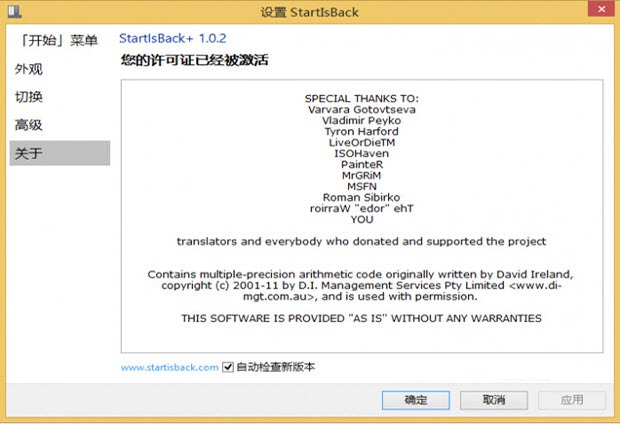 StartIsBack +1.0.3 特別版,支持簡(jiǎn)體中文,由卡飯ikimi仿原版封包,安裝后即可激活無(wú)需注冊(cè),安裝包帶有效數(shù)字簽名。