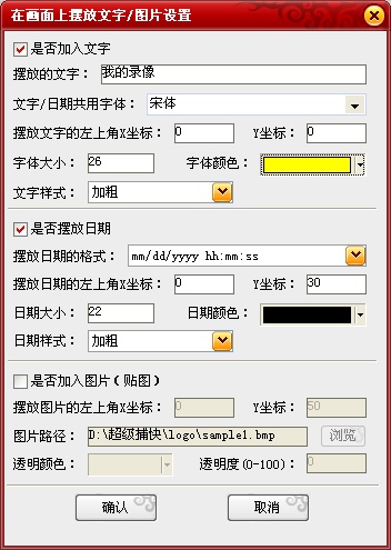 除了錄制攝像頭視頻,我們還可以為視頻添加水印、文字、錄像日期等。點擊“DV/DC/TV/攝像頭捕捉”選項卡下方的“設(shè)置文字/貼圖”按鈕,在在彈出的對話框中即可設(shè)置。你可以為錄制的視頻打上自己的LOGO!