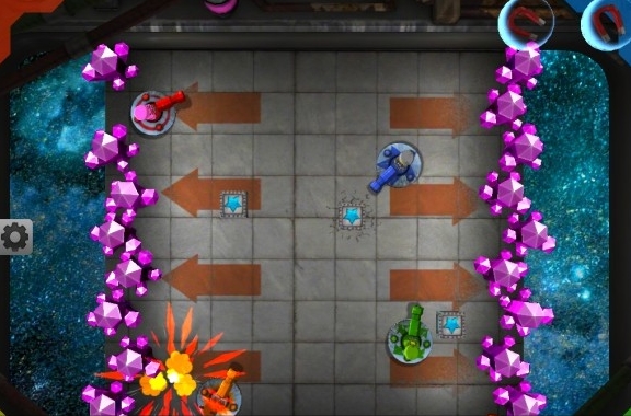四種不同的顏色代表了四個(gè)小伙伴,小伙伴坐在一個(gè)可以移動(dòng)的炮塔上面,互相“炮轟”對方。你可以直接把其他小伙伴打到陷阱里,也可以借助地圖中的特殊機(jī)關(guān),直接置對方于死地。