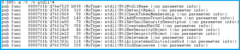 x /t /v ntdll!* 列出 ntdll 模塊數(shù)據(jù)類型和符號類型