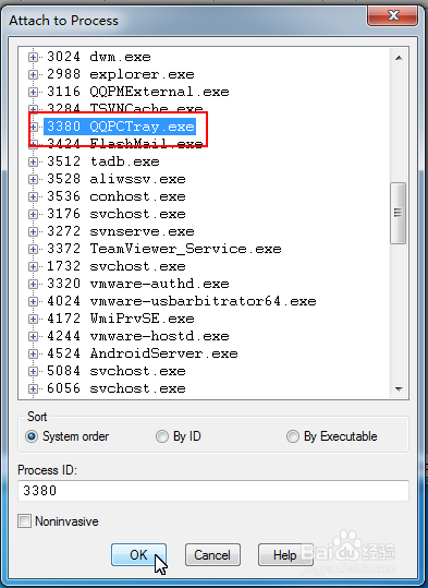 在打開的列表中選擇你要調(diào)試的進程。