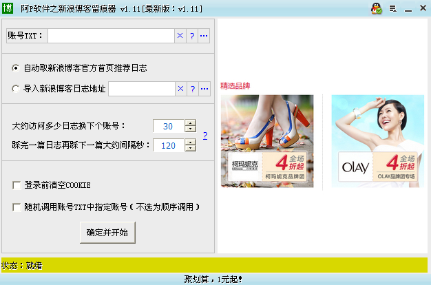 1.所導(dǎo)入賬號必須為新浪賬號,且該賬號必須已經(jīng)開通了新浪博客?! ?br />2.推薦使用單獨(dú)的電腦運(yùn)行本程序,減少第三方軟件對本程序的干擾?! ?br />3.軟件對用戶導(dǎo)入的賬號未做有效性判斷,請用戶導(dǎo)入前自行校檢欲導(dǎo)入賬號是否可用,以確保可正常留痕?! ?br />4.測試發(fā)現(xiàn)如某賬號頻繁登錄,新浪會對其限制一段時間。推薦使用多賬號輪踩,不要單用一個賬號?! ?br />5.軟件提供全免費(fèi)、全功能使用,運(yùn)行過程中軟件會隨機(jī)訪問作者指定的一些網(wǎng)頁,以使作者有動力繼續(xù)完善這個軟件,特此告知,敬請諒解。如不同意,請勿使用本軟件?! ?br />6.手工操作新浪博客也不能正常響應(yīng)時(如服務(wù)器維護(hù)、服務(wù)器出錯之類),本軟件也無能為力。