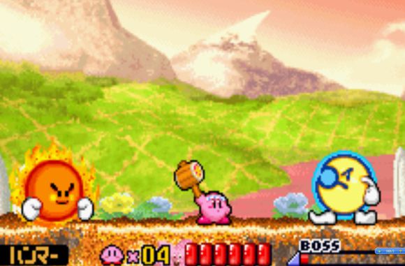 A鍵為跳,再按一下就會(huì)含一口氣在肚子里,可以飛起來(lái)。從高處(2/3個(gè)屏幕高)掉下來(lái),就會(huì)大頭朝下落,這樣也是有攻擊力的。在肚子鼓起來(lái)的時(shí)候按B鍵是吐氣,有攻擊力的,攻擊距離很短。在肚子空的時(shí)候按B鍵是吸氣,可以吞掉敵人,就算是有墻隔著的地方也可以吸到。如果是吸到有特殊能力的敵人,按一下十字鍵的下鍵就可以復(fù)制敵人的能力。吸入兩個(gè)敵人再按下鍵,就可以用輪盤選擇能力,等它自動(dòng)停下來(lái)的話,是大錘能力;吸入兩個(gè)敵人后噴出,噴出的星星有穿透效果。(如果將星星和敵人同時(shí)吸入再使用,則使用星星的能力)如果蹲著按B鍵可以做出滑鏟的動(dòng)作。