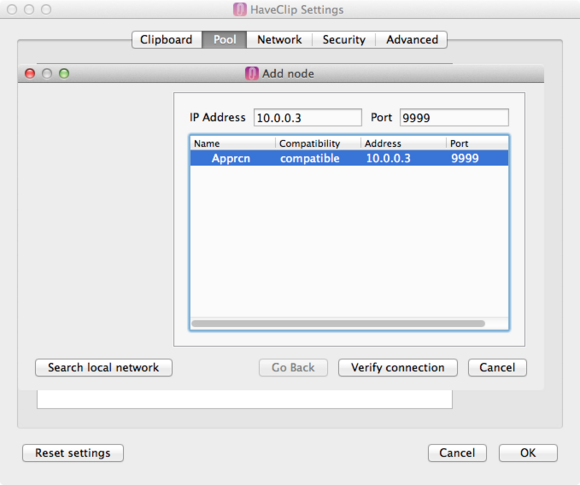 接著就是到「Pool」里添加認(rèn)證節(jié)點(diǎn),就是你想要讓哪些設(shè)備接入這個(gè)云剪切系統(tǒng)里去,如果是局域網(wǎng)的機(jī)器直接點(diǎn)擊「Search local Network」搜索即可,如果是外網(wǎng)的話就輸入 IP 地址以及端口號(hào),選中機(jī)器然后點(diǎn)擊「Verify connection」進(jìn)行鑒定。