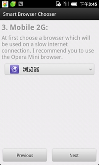智能瀏覽器選擇器Smart Browser Choosers是一款能夠設(shè)置哪個(gè)手機(jī)網(wǎng)絡(luò)狀態(tài)使用哪個(gè)手機(jī)瀏覽器的工具,比如手機(jī)在WIFI狀態(tài)下使用QQ手機(jī)瀏覽器,3G網(wǎng)絡(luò)狀態(tài)時(shí)候使用UC瀏覽器,這些設(shè)置好了,手機(jī)就能夠智能幫我們完成選擇的工作!手機(jī)多瀏覽器的就比較方便了。