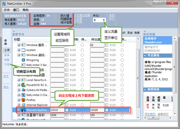 通過它,您可以直接來控制每個程序?qū)nternet的訪問以及流量分配情況。例如,您可以用NetLimiter來為單個程序甚至是單個網(wǎng)絡(luò)連接限定其上載和下載速度。通過非常簡單的設(shè)置,NetLimiter就可以讓你隨心所欲地在各個程序之間分配網(wǎng)絡(luò)帶寬。