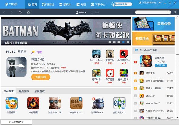 TT助手電腦版是一款windows系統(tǒng)下為蘋果手機(jī)免費(fèi)快速安裝應(yīng)用的第三方管理軟件。操作簡便,不需注冊登錄,無需越獄,不用了解itunes,下載安裝蘋果游戲和軟件,一鍵完成。