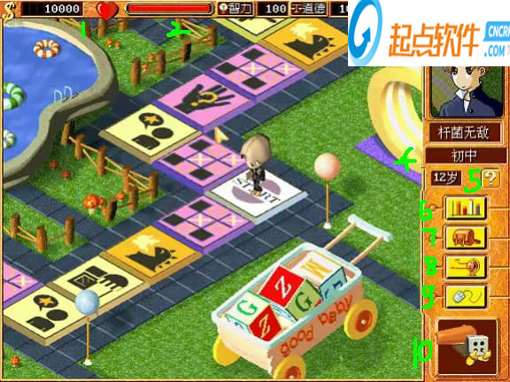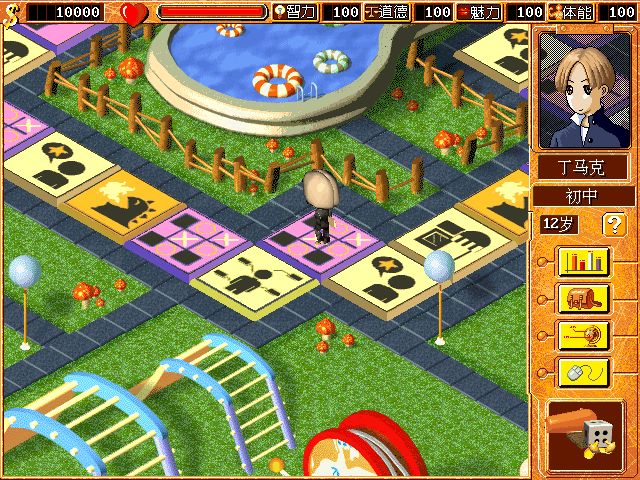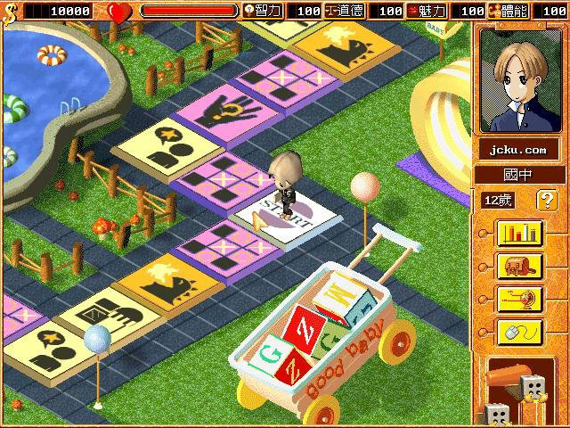 在上學期間(包括無業(yè))要經常去參數(shù)格買升參數(shù)的道具,可以升參數(shù)獲得更高職業(yè),不過參數(shù)升到4500-5000多時就不要升了,那就去小游戲玩游戲增長,因為參數(shù)是按比例增長的,所以到職業(yè)期間就不要去參數(shù)格花錢了。增長參數(shù)最好的地方是無業(yè)期間,無業(yè)期間不計入總回合數(shù),只要考大學時分數(shù)低于60分就可以進入無業(yè)期間,無業(yè)期間的地圖中間也有START格,會頒發(fā)金錢和參數(shù),當然參數(shù)可以自己調整。如認識女友(男友)時參數(shù)格會賣增加愛情度的道具。