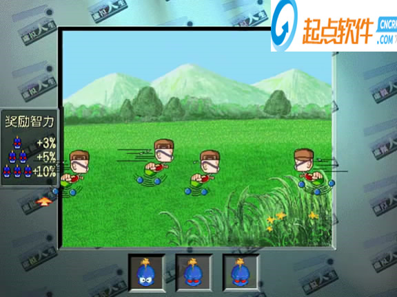 草地上有幾個小朋友玩,其中一個怪物混入,玩家等小朋友排隊后點擊讓他們亂跑,看好怪物變成的人,然后排隊后點擊怪物的位置,連玩家眼力的,增長智力的小游戲。